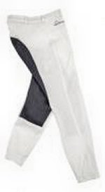 Bryczesy na zawody - atrakcyjne bryczesy renomowanej firmy Villa Horse, białe, z pełnym lejem, z imitacji szarej skóry (zmywalnym), idealne na zawody! Nogawki na dole zapinane na mocny rzep. Eleganckie i bardzo wygodne!