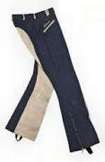 "Jodhpur" - bardzo atrakcyjne i modne bryczesy renomowanej firmy Villa Horse, granatowo-beżowe, z pełnym lejem wykonanym z imitacji skóry (zmywalnym). Nie tylko eleganckie i modne, ale też niezwykle wygodne! Posiadają dwie, zapinane na zamek kieszonki oraz szlufki w pasie, w kontrastowym kolorze. Nogawki, zapinane w dole na zamek, zachodzą na sztyblety, co sprawia, że do jazdy nie trzeba zakładać czapsów!